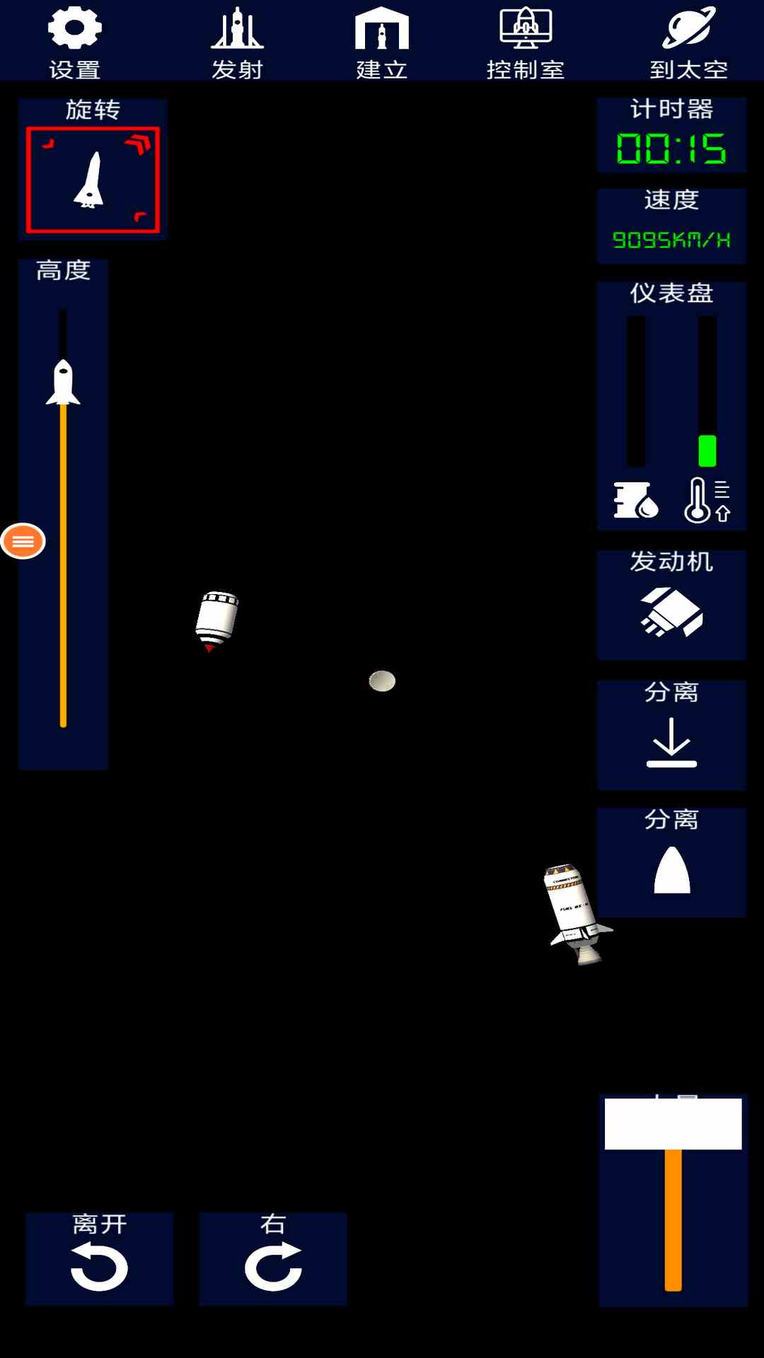 1. 零件组装系统:玩家需在编辑器中选择发动机、燃料箱、分离环等部件,通过拖拽调整位置并连接电路,错误连接会导致火箭解体,需反复测试确保稳定性。